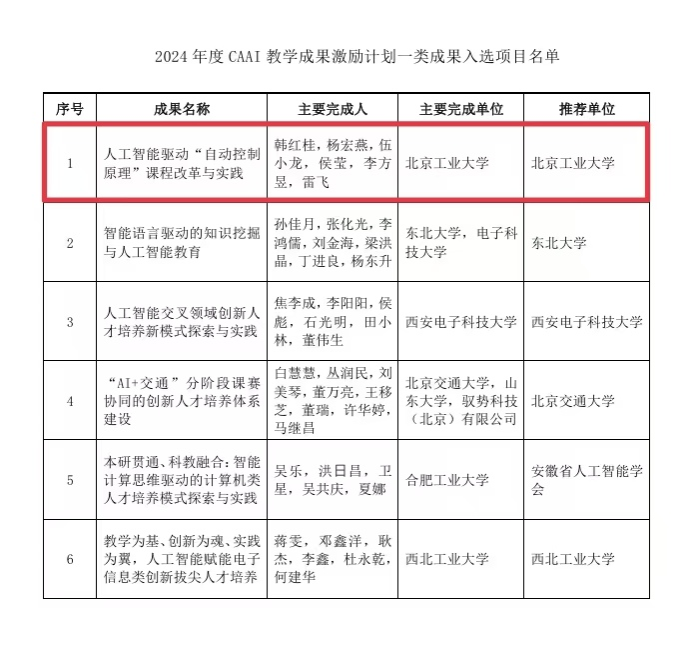 韩红桂教授团队项目入选2024年度中国人工智能学会教学成果激励计划一类成果