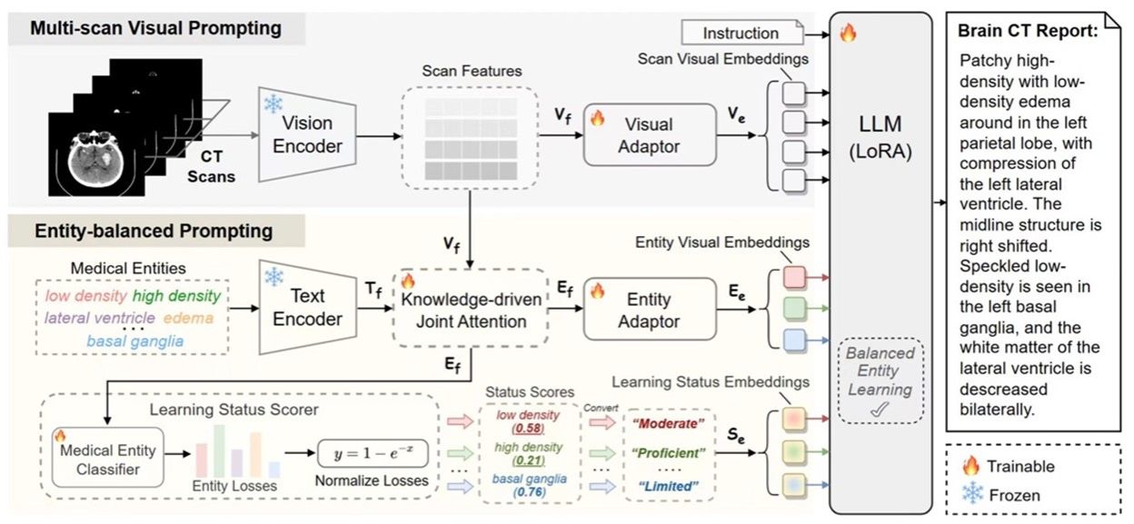 论文《MEPNet: Medical Entity-balanced Prompting Network for Brain CT Report Generation》被AAAI 2025录取,展示了团队在医学报告自动生成领域的最新研究成果。自动生成脑CT诊断报告有助于辅助医生诊断颅脑疾病,具有重要的研究意义和应用价值。由于不同医学实体在视觉分布上存在显著差异,导致模型难以均衡地学习多样的病理信息。针对这一问题,本文提出了一种面向脑CT报告自动生成任务的医学实体平衡提示网络(MEPNet)。该方法通过引入医学实体的视觉嵌入和学习状态作为辅助线索,引导大型语言模型(LLM)平衡地学习多样的医学实体,从而有效提升脑CT报告的生成质量。在多个脑CT报告生成基准数据集上的实验表明,所提方法生成的报告在临床准确性和文本连贯性上具有显著效果。