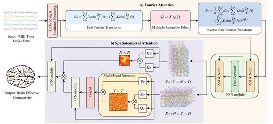论文《Brain Effective Connectivity Estimation via Fourier Spatiotemporal Attention》被KDD2025录用,展示了团队在脑效应连接网络学习领域的最新研究成果。现有的脑效应连接学习方法通常采用分离的方式提取功能磁共振成像(fMRI)数据的时间依赖和空间特征,忽略了现实世界中fMRI数据统一的时空相关性。此外,fMRI数据中的高噪声水平进一步限制了现有方法的性能。针对上述问题,本文提出了一种基于傅里叶时空注意力的脑效应连接学习方法(Fourier spatiotemporal attention, FSTA-EC)。具体来说,该方法首先利用傅里叶注意力将高噪声的fMRI数据转换到频域。然后,通过一个可学习的滤波器来自适应地学习与大脑活动相关的频率成分,并将去噪后的fMRI数据映射回物理域。最后,利用时空注意力机制将时间注意力和空间注意力融合在一个统一的框架中,进而同时学习fMRI数据的空间动态和序列内的时间依赖关系,实现时间特征与节点间空间关系的深度融合。在模拟数据和真实数据集上的实验结果表明,该方法在脑效应连接学习及其下游任务(脑疾病诊断)中均表现出优异的性能。