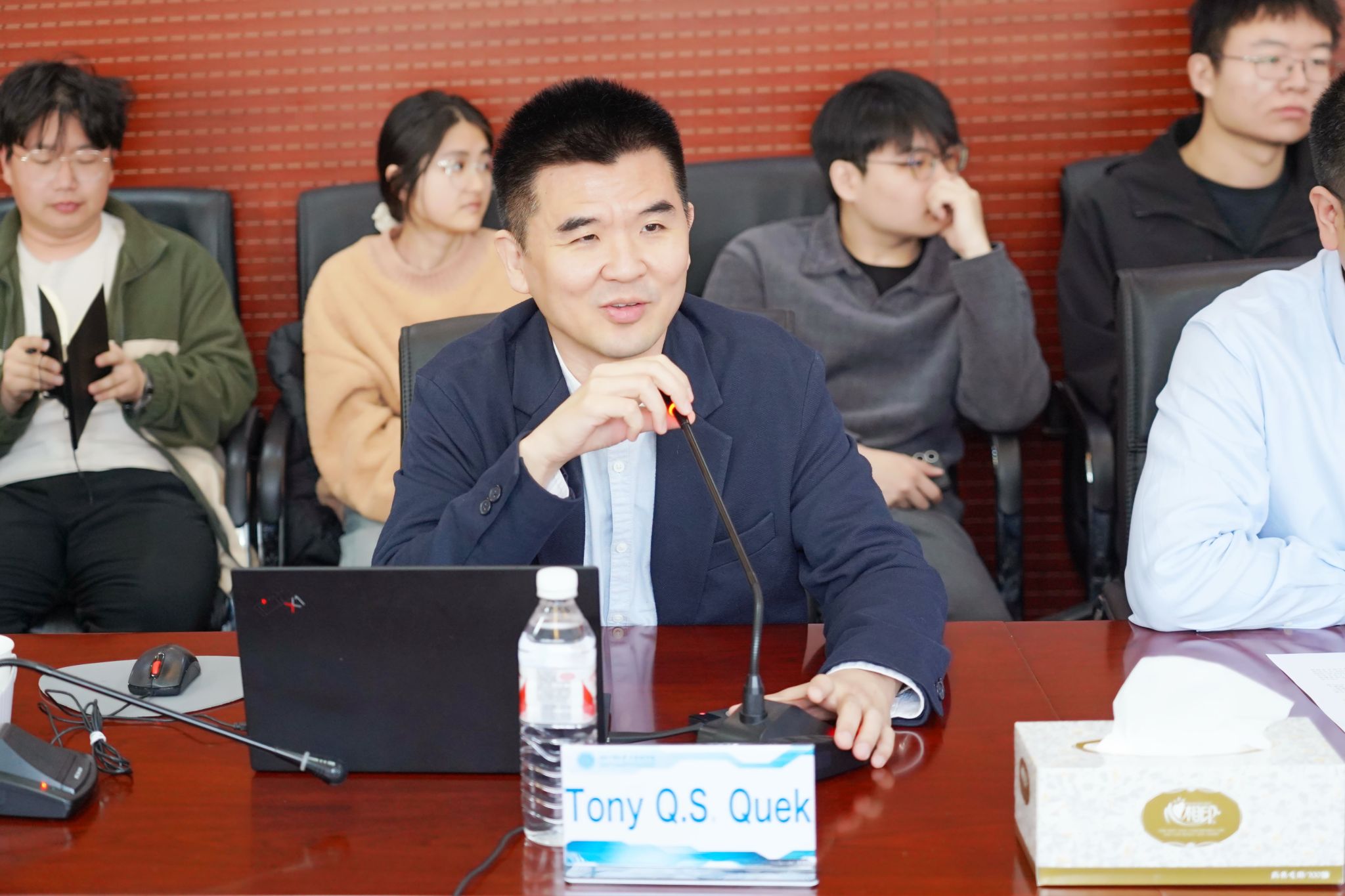 随后,Tony Q.S.Quek院士以“人工智能驱动的无线接入网(AI-RAN)”为题作学术报告,围绕AI-RAN技术阐明其在人工智能原生网络中的战略价值,并分享研发AI-RAN平台的最新成果及在中国本土化建设该平台的创业计划。深入剖析了技术创新与产业应用的融合路径,为在场师生带来了前沿学术视角与启发。报告结束后座谈交流环节,双方就学术问题、研究方向、国际学术合作机会等内容进行了互动交流,现场氛围热烈。