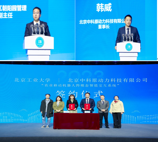 揭牌仪式结束后,中关村科技园区朝阳园工委委员、副主任王熙和北京中科原动力科技有限公司董事长韩威分别上台致辞。在学部党委书记杜峰和公司科学技术发展院副经理闫健卓等人共同见证下,韩威董事长与信息学部马楠教授就“农业移动机器人跨模态智能交互系统”相关技术签署技术转让合作意向书。