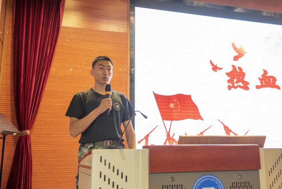 接下来,数字媒体技术专业本科生、退伍老员工乃比江·克热木拉发言,激情讲述他在军营磨练意志、塑造自我、守卫边疆、保卫祖国的故事,鼓励同学们以饱满的状态完成军训任务,携笔从戎,参军报国。