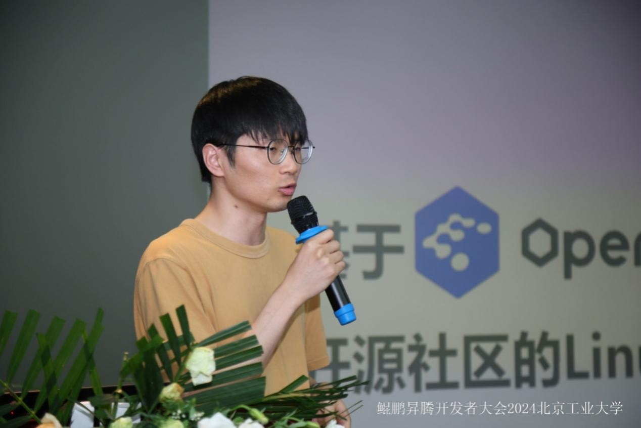 接着,优秀员工代表张子博分享了参与“智能基座”项目的学习经历和心得。张子博同学表示“智能基座”项目让同学们有机会接触到前沿的科技和理念,培养了同学们的创新精神和实践能力。希望更多的同学加入,充分利用鲲鹏、昇腾产业社区等开源社区平台,为自身的技术兴趣点找到更多的发展空间。