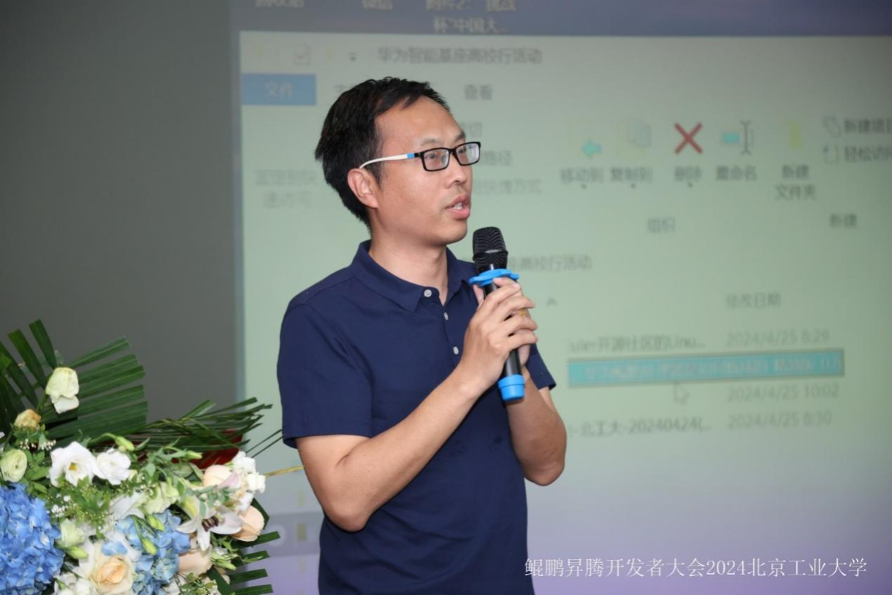 首先,信息学部副主任张利国老师致辞。他回顾了“智能基座”产教融合协同育人基地项目三年来取得的成果,自2020年12月“华为-北工大智能基座”项目签约以来,华为与北工大以课程共建、资源共建、竞赛共建、团队共建等多种方式进行合作。北工大已有35位教师参与华为相关课程的培训并取得证书,两门课程获评“华为智能基座”金课;双方共同打造的21门课程,融入了华为的前沿科技成果,覆盖员工3500余人次。他表示未来双方将继续推进深入合作,围绕“智能基座”项目,从众智项目、竞赛合作、科学前沿等角度,建立更为紧密、可持续发展的合作机制,共同努力培养出更多适应时代发展需求的高素质创新型人才。