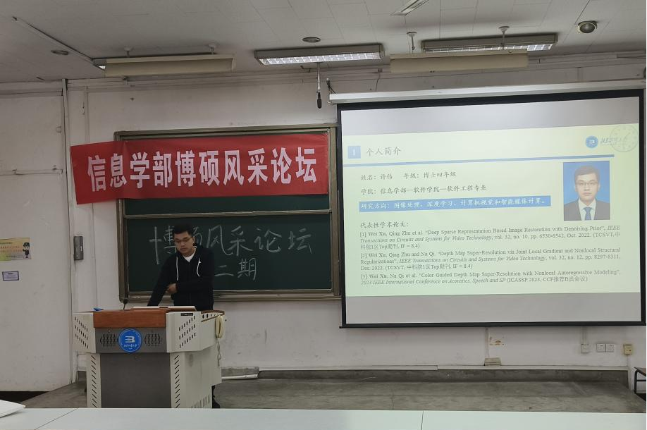 信息学部科技节系列活动——“博硕风采论坛”第二期于11月3日在信北阶教室成功举办。本场论坛邀请到获奖奖学金获得者2020级软件工程专业博士研究生许伟、2021级计算机技术专业硕士研究生林胜和2021级电子科学与技术专业硕士研究生张晓羽三位同学带来报告。