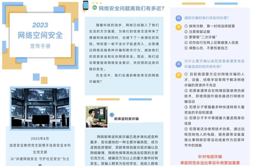 为深入宣传贯彻习近平总书记关于网络强国的重要思想,落实习近平总书记对网络安全工作“四个坚持”的重要指示精神,深入宣传《网络安全法》等网络安全领域重要法律法规、政策标准,进一步普及电信网络防诈相关知识,增强校内及周边社区人员网络安全意识,信息安全本科生党支部联合信息安全教师党支部在网络安全宣传周来临之际,开展了网络安全宣传相关系列活动。活动内容包括网络安全宣传手册的制作、校内及周边社区的网络安全宣传和手册发放以及网络安全公众号推送宣传。