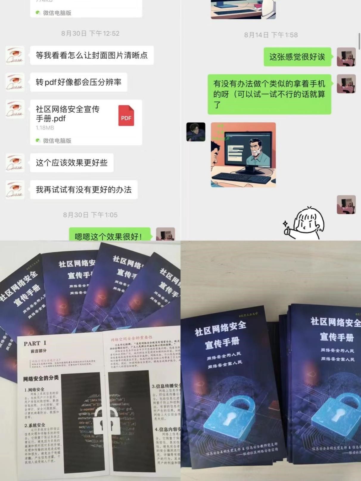 自8月份起,信息安全本科生党支部开始手册的设计和制作工作。工作内容包括网络安全宣传手册主题确定、文案撰写、插图制作、设计排版以及打印制作等。历经一个多月的打磨后,网络安全宣传手册于9月份制作完成。