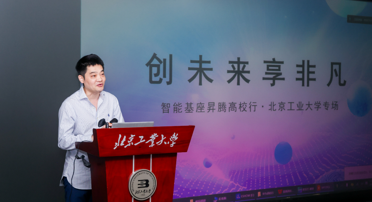接下来进入授课环节,北京昇腾人工智能生态创新中心生态总监王瑞平带来了《数智未来 因你而来》的分享,介绍了人工智能技术的发展以及华为在人工智能产业的投入,并展示了华为依托创新中心在应用孵化、科研创新、人才培养等领域为北京服务的情况。此外,王瑞平还对昇腾AI基础软硬件平台及一系列华为昇腾为高校开发者提供的扶植计划以及竞赛活动做了详细介绍,使在场同学们对昇腾AI有了更多的了解。