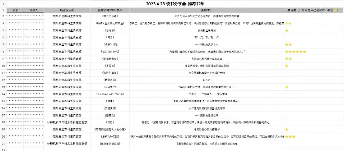 4月10日起,信息安全本科生党支部发起了“信安人心中的年度图书”征集活动。支部内的同学们踊跃分享了自己最喜欢或者最想推荐的一本书,并充分表达了自己的推荐理由。