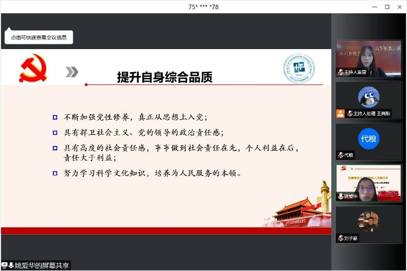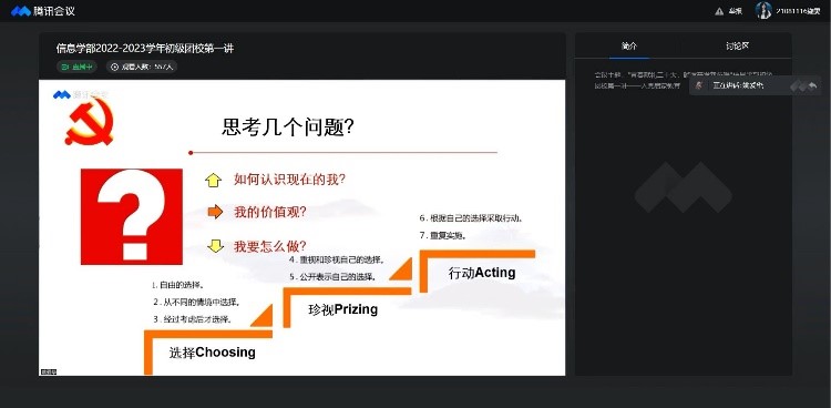 2022年9月3日,信息学部举办“青春献礼二十大 踔厉奋发新征程” 2022-2023学年信息学部初级团校第一讲。为响应公司疫情防控政策,本次活动以线上形式开展。参与本次活动的有信息学部正处级组织员姚爱华、信息学部党委副书记王丽君、员工党建工作办公室主任代粮、团委书记刘子豪以及2022级全体新生,活动由团委直属员工机构组施雯主持。