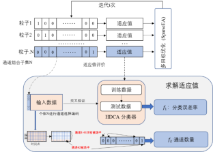 课题组成员针对脑电信号数据通道冗余的问题,提出了基于多目标优化的通道选择方法如图4所示。基于大规模稀疏进化算法(SparseEA)对通道信息进行优化,并实现通道选择结果的跨被试迁移,节省被试校准的时间,以提高单被试实验的分类精度并实现跨被试应用。通过实验验证发现,项目组提出的跨被试通道组合模型可获得比对比方法更好的性能表现。同时,通道选择结果中RSVP诱发区域集中于前额叶和枕叶,与心理学实验结果相印证。成果于2021年发表在脑机接口领域高级别期刊Journal of Neural Engineering (SCI检索,中科院2区)。