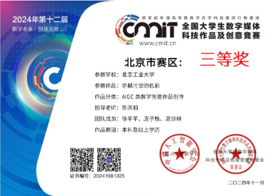 徐芊芊、庞子烁、周琮林同学《穿越时空的色彩》项目荣获北京赛区三等奖(指导教师:陈洪丽)