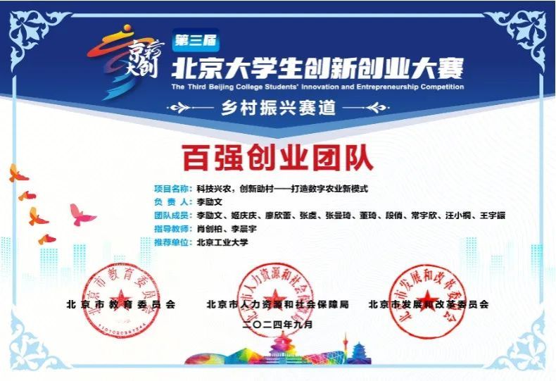 李励文、姬庆庆、王宇譞、廖欣蕾、汪小桐、张曼琦、杨未豪、沈婧、王小锐、段俏、杜佳怡、陶雷蕾、李立莹、黄诗睿、王建炜《科技兴农、创新助村—打造数字农业新模式》荣获北京赛区三等奖(指导教师:肖创柏、刘超、李晨宇、宁芮可、孙旭彤、赵旭、王宇琛、郭紫莹、张利敏)