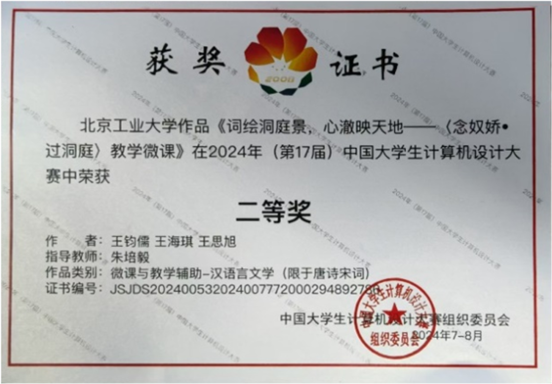 2024年12月,在北京市中华经典诵读工程系列活动暨第六届中华经典诵写讲大赛北京市初赛中,朱文哲的篆刻作品《印痕》在“印记中国”师生篆刻大赛北京市初赛中荣获手工类教师组二等奖。