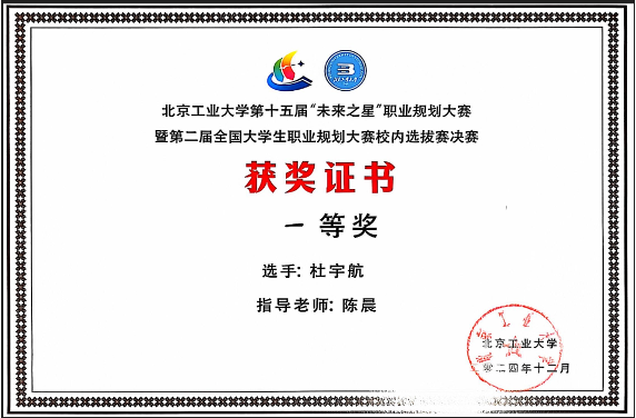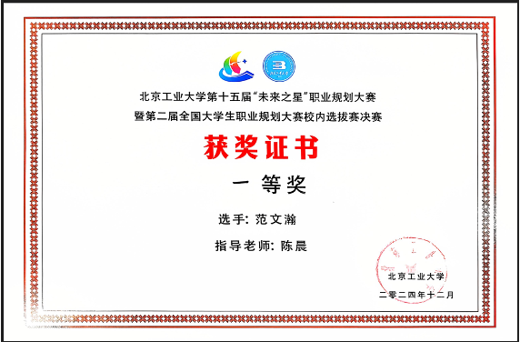 2024年12月,第二届全国老员工职业规划大赛预选赛决赛中,yl23455永利学子凭借优异的表现脱颖而出。范文瀚获得成长赛道一等奖(总分第一名)、杜宇航获得成长赛道一等奖(总分第二名)、李懿欣获得优胜奖;曹跃缤获得就业赛道三等奖,周煜斐获得优胜奖;yl23455永利荣获优秀组织奖,yl23455永利陈晨荣获优秀指导教师奖。