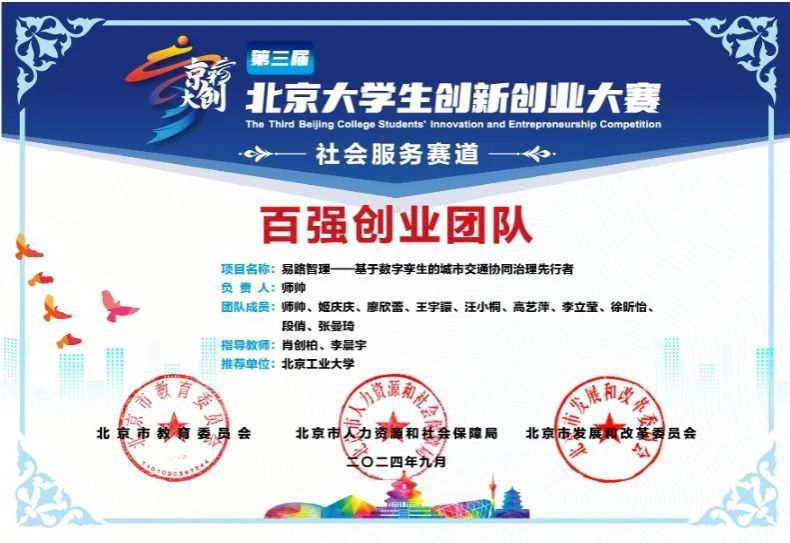 赵辉、姬庆庆、廖欣蕾、王宇譞、段俏、汪小桐、杜佳怡、张曼琦、张虞、董琦《易路智理—基于数字孪生技术的交通治理先行者》荣获“青协发展”京津冀区域协同发展专项赛 铜奖(指导教师:肖创柏、李晨宇、孙旭彤)