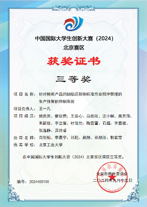 王一凡、姬庆庆、廖欣蕾、王辰心、马佳欣、汪小桐、高艺萍、朱颖佳、李立莹、杜佳怡、陶雷蕾、石超、李嘉俊、张逸静、黄诗睿《针对精密产品的缺陷识别和标准作业程序管理的生产线智能控制系统》荣获北京赛区三等奖(指导教师:肖创柏、李晨宇、刘超、赵旭、孙旭彤、郭紫莹)